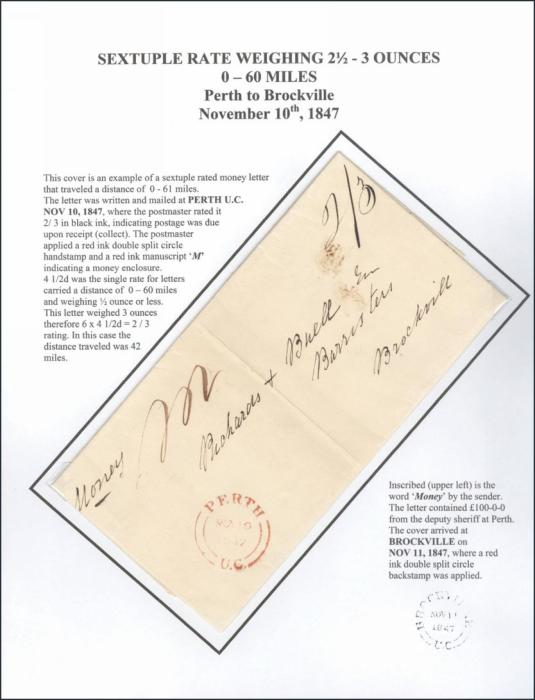 Stampless entire from the Sheriff's Office in Perth UC 10 Nov, 1847 to Brockville UC rated 2/3. Has m/s "MONEY" and large "M". Nicely written up on an exhibition page explaining the rate and markings. F (Image)