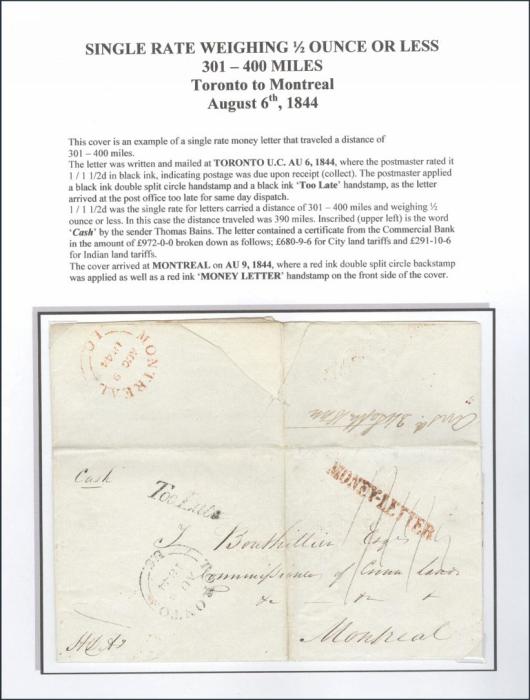 Stampless entire from Toronto UC 6 Aug, 1844 to Montreal (rec b/s). Has red s/l "MONEY LETTER" and black "TOO LATE" handstamps. Nicely written up on an exhibition page explaining the rate, etc. F (Image)