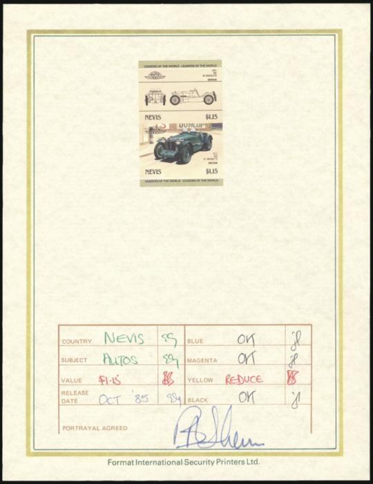 291, 307, 311, "Leaders of the World" Classic Cars Progressive Imperf Colour Proofs affixed on special Int'l Security Printers Ltd cards. Several with colour specs and these are signed by company officer. Unique items for a car topical collector. VF (6 diff proof cards) (Image)