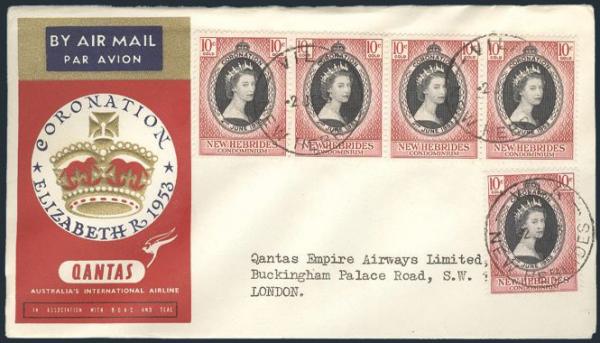 Interesting collection of QE 1953 Coronation stamps & covers. Incl complete mint set of the omnibus issues on White Ace pages plus a nice group of 29 Qantas cacheted Coronation flight covers from various rates. Also incl 4 FDC's. F-VF (106 stamps, 33 covers) (Image)