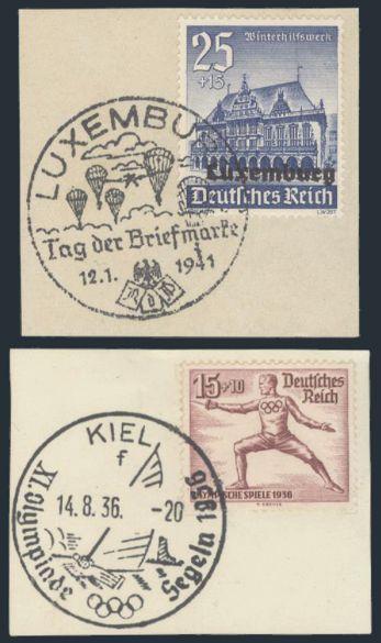 Stockbook full with a specialized collection of Third Reich cancels on piece. Has a wide range of Germany stamps plus Bohemia & Moravia, Poland Gen. Gov't & Occupation of Luxembourg. Incl all kinds of propaganda cancels, special events, Nazi themes, wartime messages, swastika types, etc. Appear almost all diff as to issue & cancel type. F-VF (209 cancels) (Image)