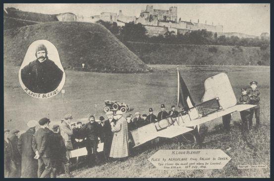 LOUIS BLERIOT'S ENGLISH CHANNEL CROSSING: Scarce unused b/w photo postcard depicting early aviator LOUIS BLERIOT after flying the first airplane over the English Channel 25 July, 1909. Shows his landing scene at Dover