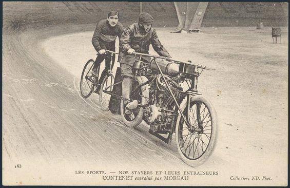 EARLY MOTORCYCLES ON POSTCARDS: Collection of 8 diff b/w France postcards circa 1905-10, depicting early RACING MOTORCYCLES along with their riders. Has various bike types and riders who are named. Some depict normal