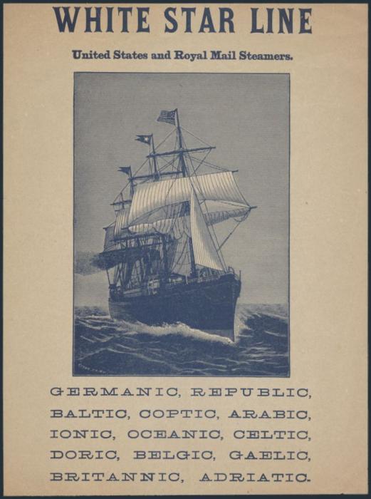 Advertising Flyer (7 x 9.25 inches) for the White Star Line of USA and Royal Mail Steamships. Has beautiful illustration of a ship on one side along with details on Trans-Atlantic ships from Liverpool and New York. This was printed by the company's agent in Chicago. F, small edge tear (Image)