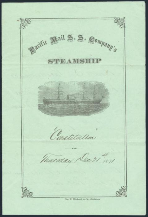 Green & black part printed ship illustrated dinner menu with "Pacific Mail S.S. Company's Steamship" printed & "Constitution 21 Dec 1871" in m/s on cover. Extensive handwritten menu. Excellent topical item from the maritime collector. F, folded (Image)