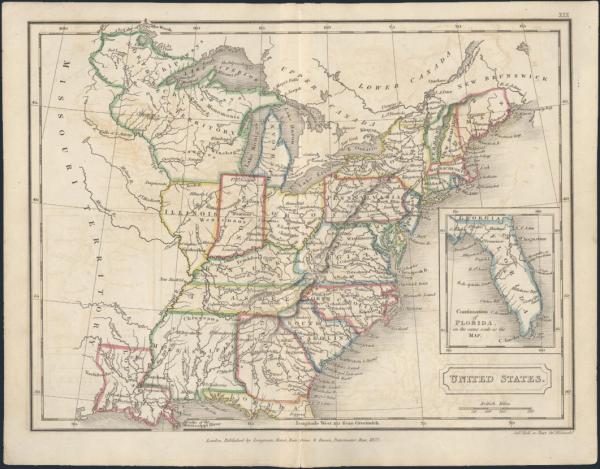 Colour illustrated map (10 x 12 in) published by Longman, Hurst, Rees, Orme & Brown of London. Depicts the Eastern United States, west to Louisiana, Illinois, "North West Territory", & "Missouri Territory". Historic. F, folded & reinforced at centre. Frameable (Image)