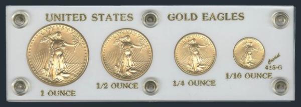 GOLD EAGLE SET: Special plastic case with a beautiful set of uncirculated GOLD Eagles from 1986. Incl 1 oz, ½ oz, ¼ oz & .1/10 oz (4 coins) (Image)