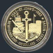 GOLD 1983 $100 GOLD: Special brown leather case with a proof 22Kt 1983 $100 GOLD St. John's coin. Contains ½ oz of pure gold (Image)