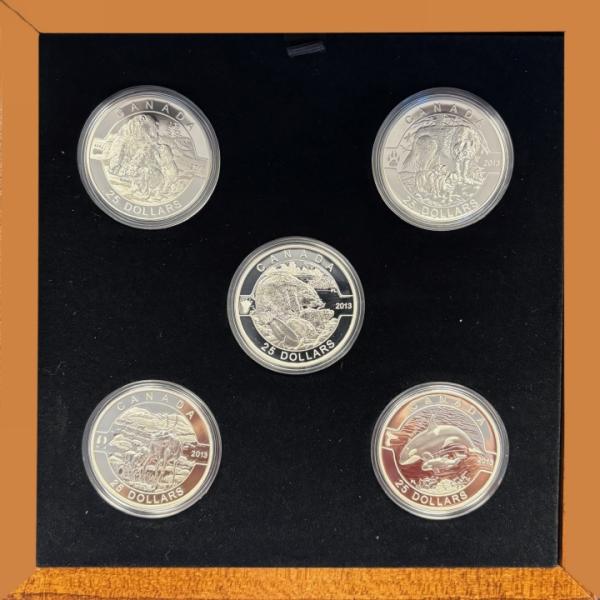 CANADA $25 SILVER COINS: Special wooden box with a beautiful set of five diff 2013 proof $25 SILVER coins from the O Canada series. Incl Beavers, Polar Bears, Wolves, Caribous & Orcas (5) (Image)