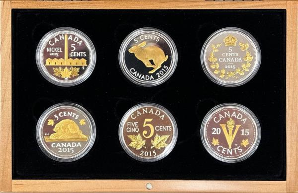 LEGACY OF THE CANADIAN NICKEL: Special wooden box with a spectacular set of six diff large size SILVER Proof coins from 2015 with gold highlights commemorating the legacy of the Canadian Nickel (6) (Image)