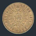 PRUSSIA 20 MARK GOLD: Prussia 1875 20 Mark GOLD coin with "A" (Berlin) mint mark & portrait of Kaiser Wilhelm II. EF (Image)