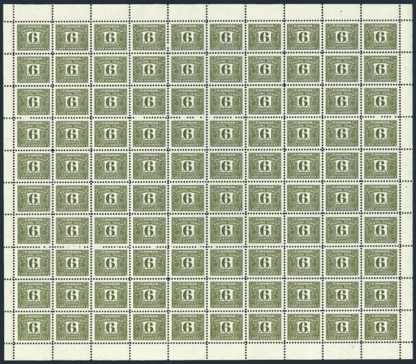 FPS46, Complete sheet of 100 of the 6¢ olive third issue Postal Scrip Revenue. VF, NH, 5 stamps at top with light DG. A RARE SHEET! Cat $6,250 (Image)