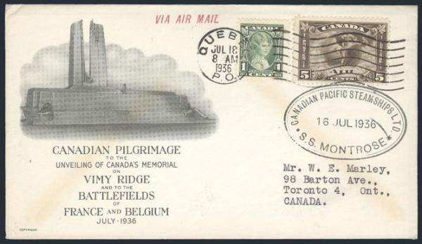 211/C4, Tied by Quebec 18 July 1936 cancels on 7 cach CANADIAN PILGRIMAGE to VIMY RIDGE & BATTLEFIELDS special event covers (4 are Airmail incl a good C2). All have "S.S. MONTROSE" ship cancels (Ludlow #S-152, RF475). F (7 covers) (Image)