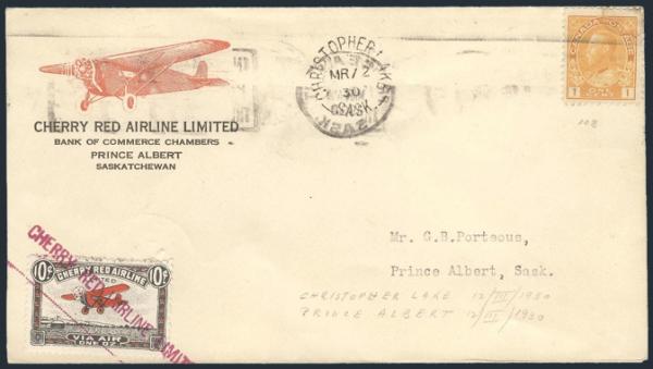 CL46 (2), CL46i (2), Four diff Cherry Red Airline semi-official airmail FFC's from Dec 1929 to Mar 1930 incl one with cachet, one with Red Airplane illustrated corner card & two with Snow on Wings variety. F-VF (Image)