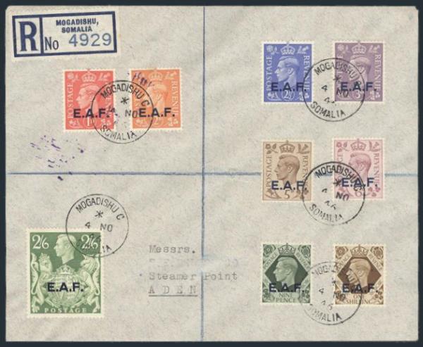1168 1-9 image1-9, Complete set neatly tied by Mogadishu Somalia 4 Nov, 1946 CDS's on Reg'd cover to Aden (rec b/s). VF (Image) Estimate 150.00+ $Cdn