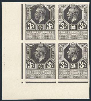 1156   imageImperforate corner block of a KGV 3 Shilling ESSAY in black. Has a very similar design to Scott #118. Printed on stout white ungummed paper. VF. A PRETTY SHOWPIECE! (Image) Estimate 400.00+ $Cdn