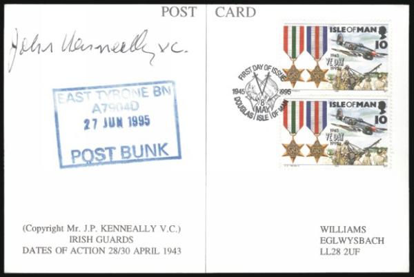 1164 636 image636 (Pair), Tied by fancy Douglas 8 May 1995 F.D. cancel on b/w illustrated postcard which is autographed by VICTORIA CROSS winner JOHN KENNEALLY. The postcard depicts Kenneally's one-man charge on a German position in North Africa 1943. VF (Image) Estimate 50.00+ $Cdn