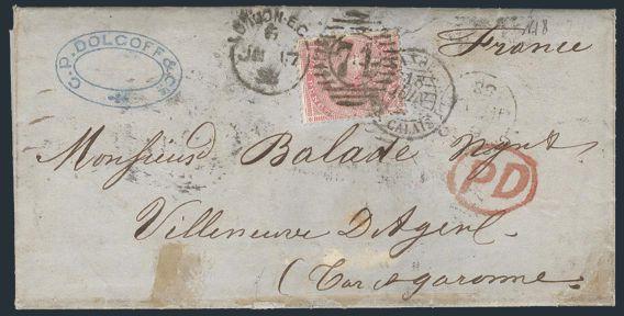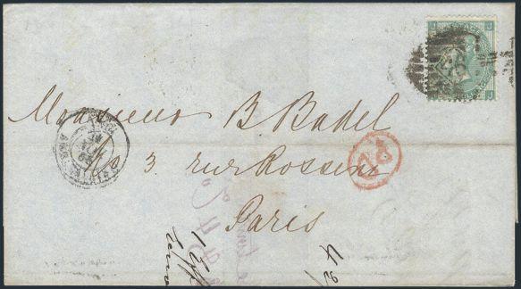 Tied on folded cover from London 20 Nov, 1865 to Paris France (rec b/s 21 Nov '65). Has oval company h/s on reverse. F. Cat $525 US (Image)