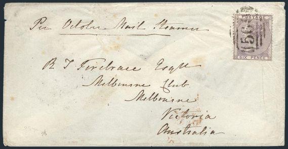 tied by numeral oval cancel on 1857 cover to MELBOURNE AUSTRALIA. Has m/s "PER VICTORIA MAIL STEAMER" and VF red backstamp SHIP LETTER GPO VICTORIA / FREE / 8 JA 1858. F. Cat $275+ (Image)