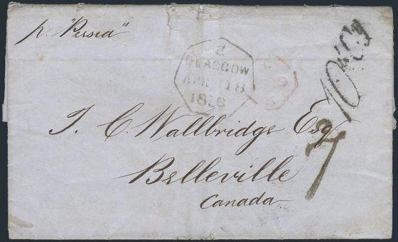 Trans-Atlantic folded letter with Glasgow on 18 Apr 1856 octagonal cancel via ship "Persia" to Belleville, Ont, Canada. Has 2 diff hammer rates. F, edge tear (Image)