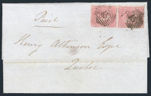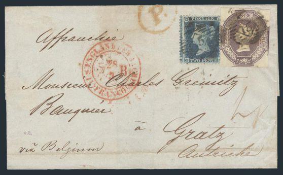 Tied together by numeral '15' cancels on an 1855 folded cover to GRATZ AUSTRIA (rec b/s). Has red oval "P.D" and red 28 Mar "England Per Aachen / Franco" double-circle datestamp. F. An attractive 2-stamp franking. Scott $2,850+ US (Image)