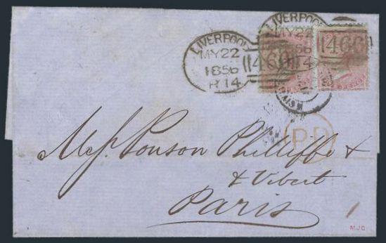 Tied by Liverpool 22 My, 1856 spoon cancels on cover to Paris, France (rec b/s). F. Stamps alone Cat $1,250 US (Image)