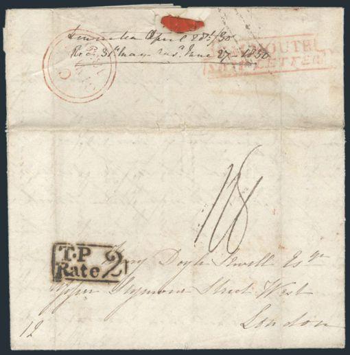 folded Trans-Atlantic letter from Quebec 1830 to London. Has red stepped boxed "FALMOUTH SHIP LETTER" on reverse. Has been rated "1/8" and with "T.P.Rate 2" handstamp. F
