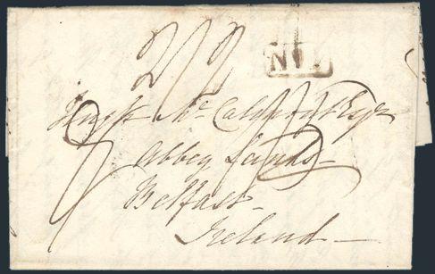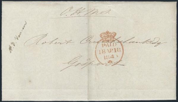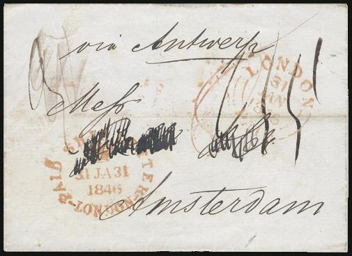 cover with red London/Paid double split-ring and PAID SHIP LETTER/LONDON crown illustrated 31 Jan 1846 cancels to Amsterdam. Has red Antwerp 2 Feb transit, oval Angleterre Par Anvers h/s and Amsterdam 3 Feb receiver. F (Image)