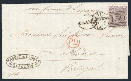 Tied by Glasgow 5 Sept 1866 duplex '159' cancel on folded cover to LISBON PORTUGAL (rec b/s). Neat oval Glasgow company h/s on front side. VF. Cat $260 (Image)