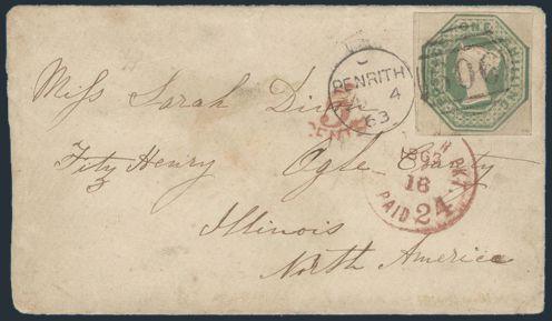 Shilling embossed tied by Penrith 4 June 1863 duplex cancel on Trans-Atlantic cover to USA. Has red US "5/CENTS" & "PKT Paid 24" postmarks. F-VF, minor cover soiling. Scarce. Cat $1,350 US (Image)