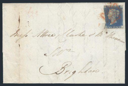 Three margin single (into at left), tied by brilliant red M/C cancel on cover date-lined 7 Oct 1840, to Brighton. F-VF. Cat $2,475 (Image)