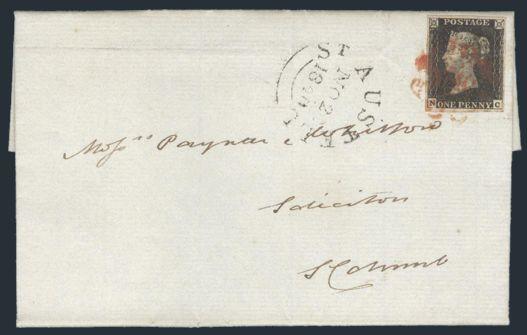 VF Four margin single tied by red MC cancel on folded letter from St Austell 22 Nov 1840 addr to St Columb. VF, file fold affects the stamp. Cat $850 (Image)