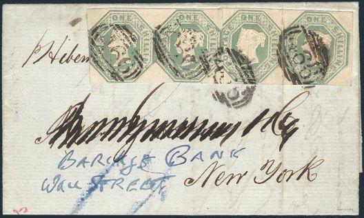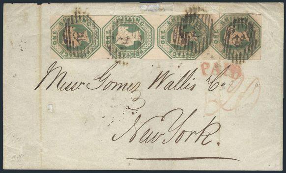 horiz strip of 4 of the QV One Shilling Embossed, tied by neat '466' grid numeral cancels on 1847 Trans-Atlantic cover to New York. Has been redirected to Barclays Bank on Wall Street. F, file fold in between 2 stamps (Image)
