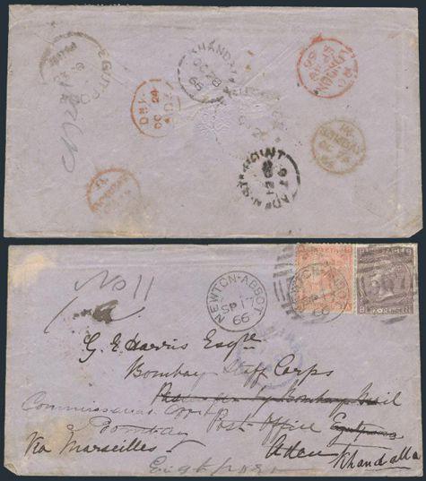 45 (Pl 5), Tied by Newton-Abbot 17 Sept 1866 duplex cancels on ship cover addr to a member of the Bombay Staff Corps, aboard Bombay Mail ship. Redirected several times finally arriving at Khandallah, India. Has London, Aden, Bombay, Egutpoora, etc.