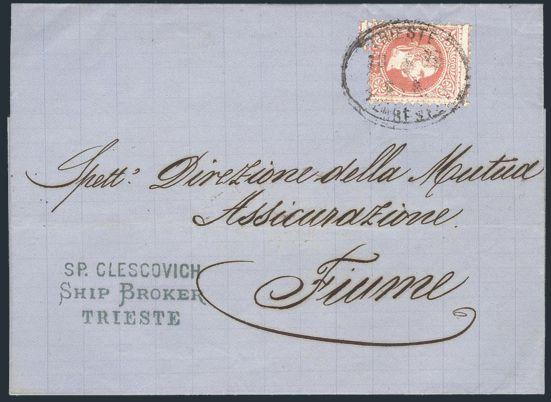 1421 29 image29, Tied by Trieste June 1870 oval cancel on folded cover to Fiume. Has "Sp. Clesovich / Ship Broker / Trieste" corner card. VF (Image) Estimate 50.00+ $Cdn