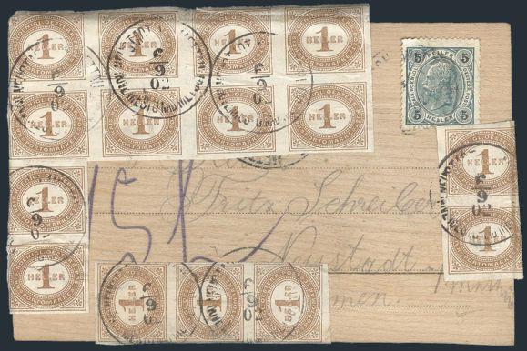 1423 73a. J10 image73a, J10 (15 - in multiples), Tied by Luhatschowitz (Czech) 6 Sept 1902 CDS's on underpaid WOODEN POSTCARD to Neustadt, Brennen. Has colour illustration of young lady & flowers. F-VF, some stamps overlap card edge. An unusual & eye-catching item! (Image) Estimate 70.00+ $Cdn