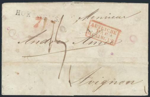 1417   imageStampless folded letter dated Dornbirn 26 Sept 1838 to Avignon, France. Has "HOHENEMS", red boxed "AUTRICHE / PAR / HUNINGUE"; Huningue & Lyon CDS transits, etc. F-VF (Image) Estimate 75.00+ $Cdn
