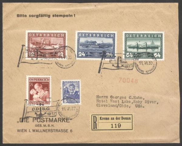 1425 358, 381-4 image358, 381-4, Tied by special flag illustrated Johann Strauss SHIP cancels on large size Reg'd cover to USA. Has "Krems au der Donau" Reg'd etiquette label. F, some edge creasing. Attractive (Image) Estimate 50.00+ $Cdn