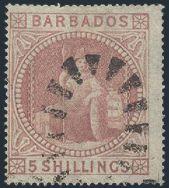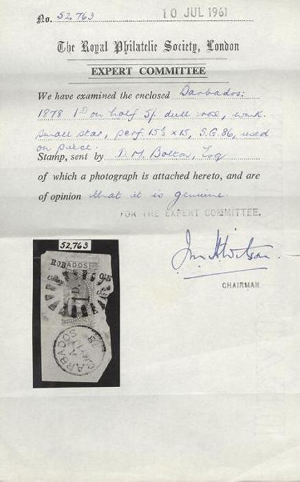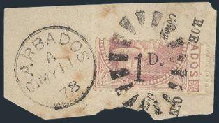 1505 57 image57, Scarce 1p on Half of 5 Shilling neatly tied on piece by bootheel cancel with Barbados 11 My, 1878 CDS alongside. Fresh colour, F. Has 1961 Royal Philatelic Society Certificate (Image) (View Certificate)