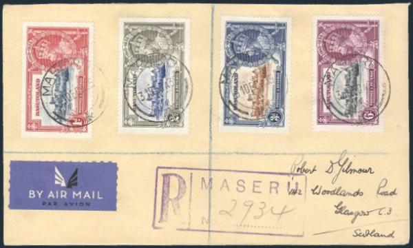 1525 11-14 image11-14, Cpl SILVER JUBILEE set neatly tied by Maseru 31 Dec, 1935 CDS's on Reg'd cover to Scotland. VF (Image) Estimate 50.00+ $Cdn