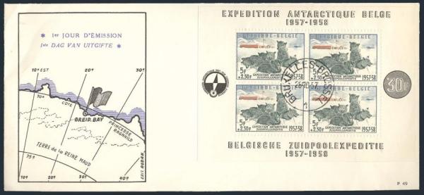 Scarce Belgian Antarctic Expedition souvenir sheet with Brussels 28 Oct 1957 CDS on cacheted cover. F-VF, minor corner bends (Image)