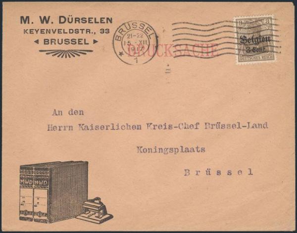 Brussels 15 Dec 1917 cancel on WWI German Occupation illustrated advertising cover for M.W. Durselen stationery. Has "DRUCKSACHE" (printed matter) h/s. VF (Image)