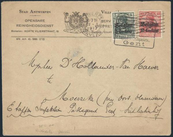 by boxed WWI German Occupation "Postal Examination Office / Ghent & Antwerp 22 Jan 1917 cancels on bilingual illustrated advertising cover for Antwerp Cleaning Service. Addr to Ghent. Shows Antwerp crest & has very large German illustrated blue