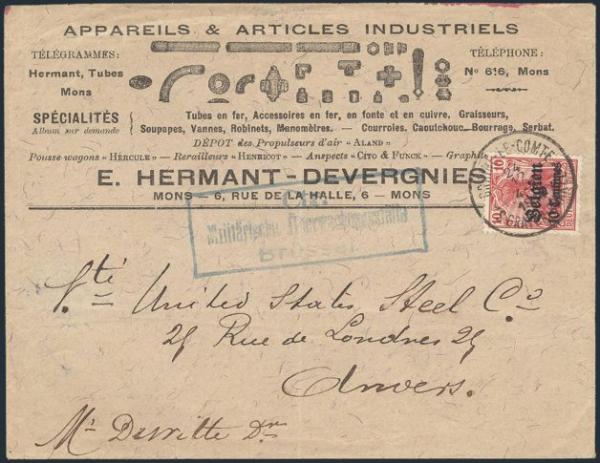 Brussels 24 Dec 1915 CDS on WWI German Occupation illustrated advertising cover for E. Hermant-Devergnies metal products. Addr to Antwerp. Has blue boxed Military censor h/s. Depicts 23 diff metal products. F-VF, light centre bends (Image)