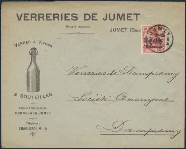 Jumet 1916 CDS on WWI German Occupation illustrated advertising cover for Verreries de Jumet glass mfg. to Dampemy. Depicts glass bottle. F-VF (Image)