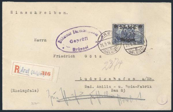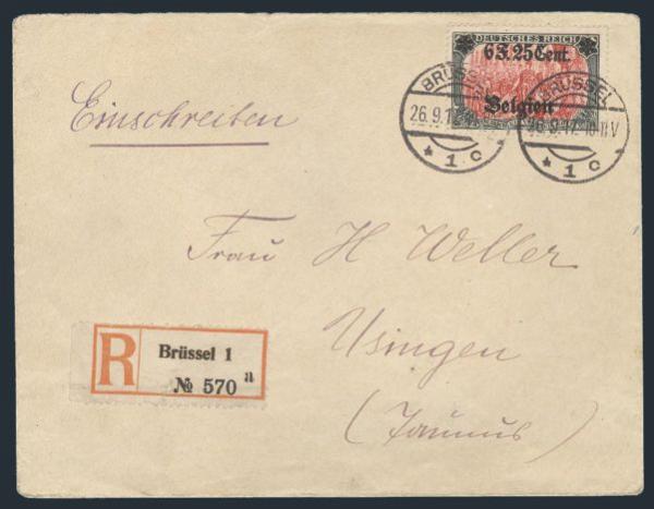 Francs 25¢ High Value tied by Brussels 26 Sept 1917 CDS's on Reg'd WWI German Occupation cover to Usingen, Germany. F-VF. Scarce item. Cat $450 US (Image)