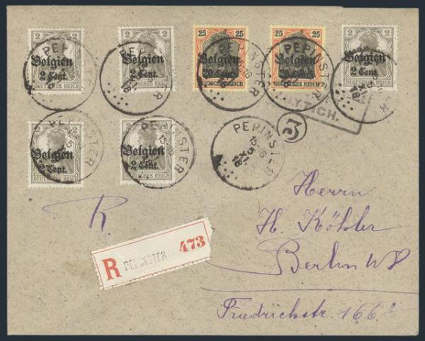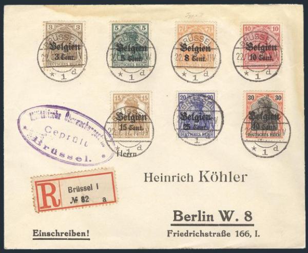 Seven diff tied by Brussels 22 Jan, 1917 CDS's on Reg'd cover to Berlin (rec b/s). Has violet oval Military Censor h/s. F, minor edge stain (Image)