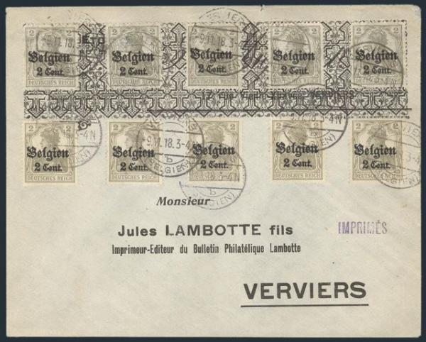 Tied by Verviers 9 Nov 1918 CDS's on local stamp dealer WWI German Occupation cover. Has printed matter h/s. VF. Eye-catching cover! (Image)