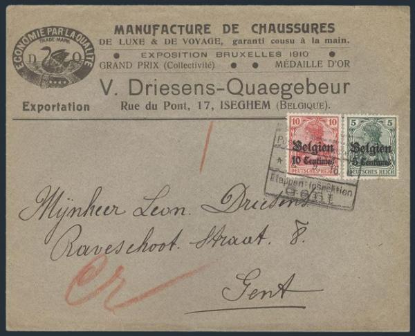 Tied by boxed Postprufungsstelle / Ettapen-Inspektion / Gent 1 Sept 1916 cancel in WWI German Occupation illustrated advertising cover for V. Driesens-Quaegebeur Co.. VF