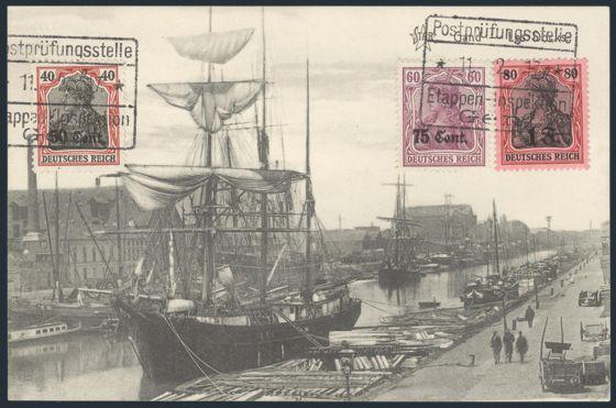 N18-22, Tied by boxed Postprufengsstelle / Etappen-Inspektion / Gent 11 Feb 1917 cancels on 2 diff b/w unaddr postcards. Cards depict Gent Post Office & tallships in Gent Harbour. Attractive WWI German Occupation items. VF (2) (Image)